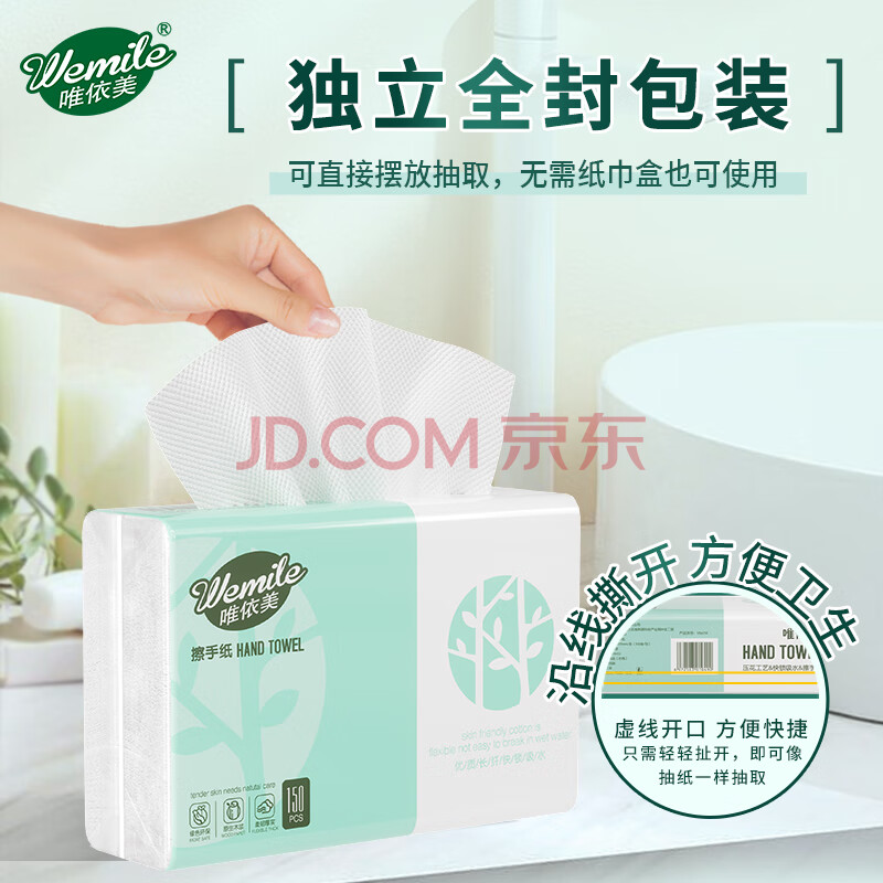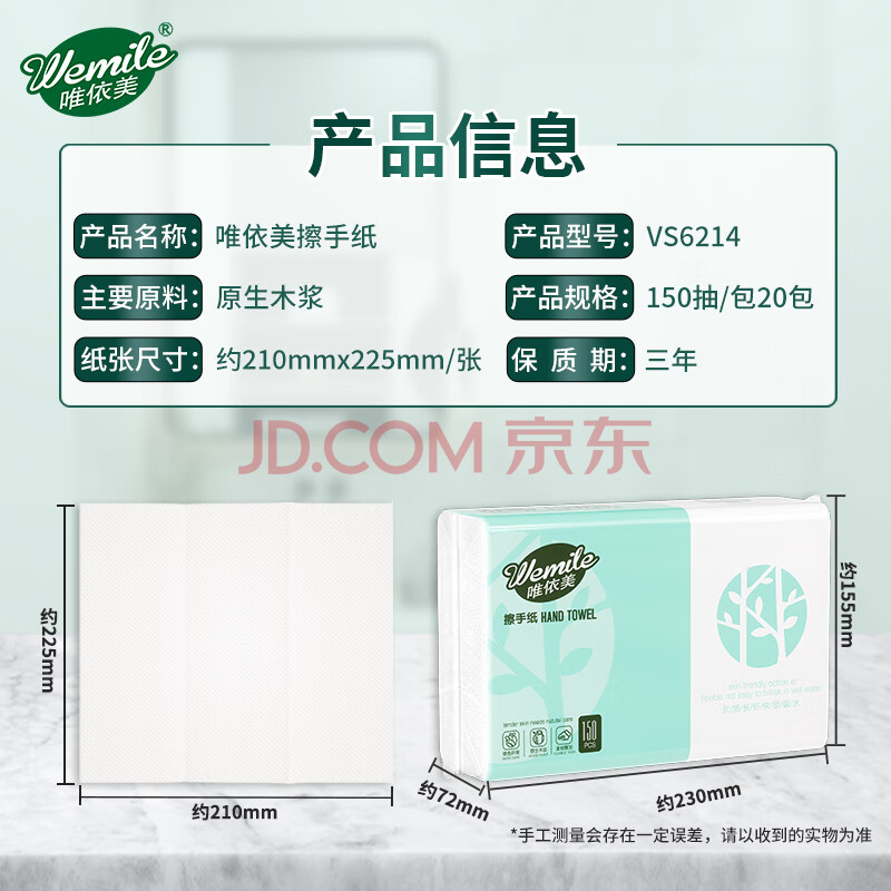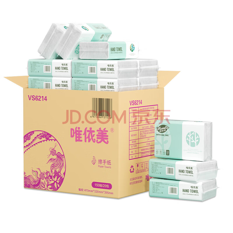 商品相册:唯依美擦手纸1层150抽*20包商用抽取式洗手间厨房吸油干手纸整箱VS6214第