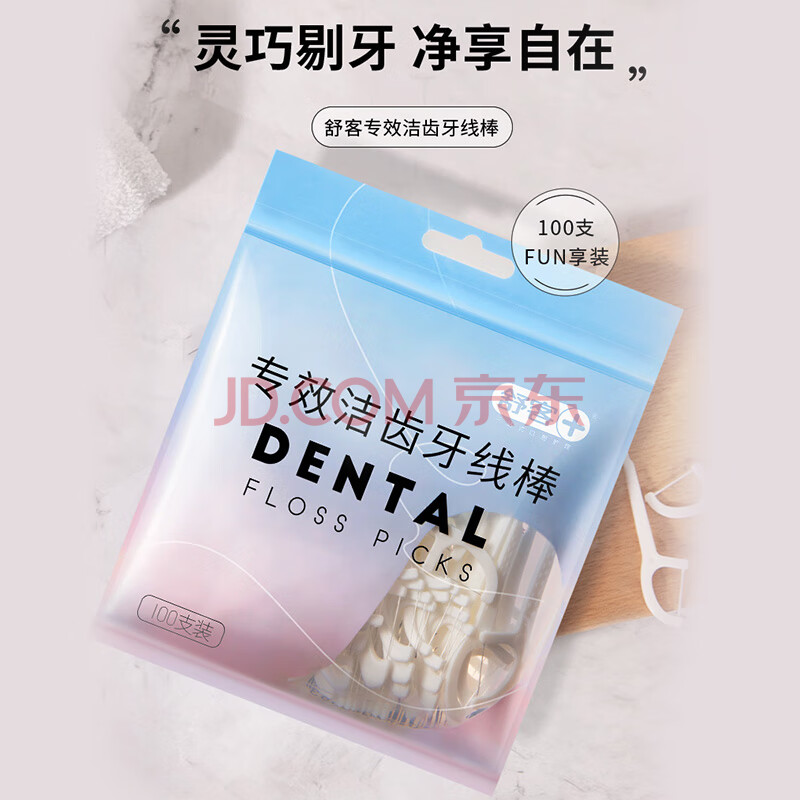 商品相册:舒客专业洁齿牙线棒 便捷牙签清洁齿缝剔牙圆线护齿100支*3袋新旧随机第