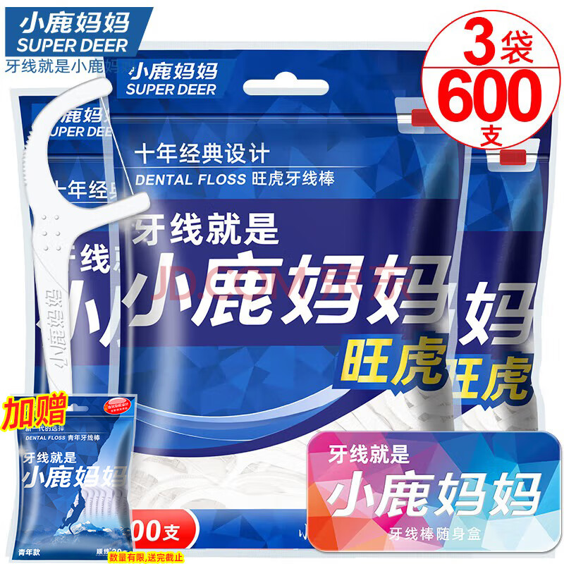 商品相册:小鹿妈妈超细牙线棒护齿家庭装齿缝牙签200支/袋*3袋共600支 便携随身盒第