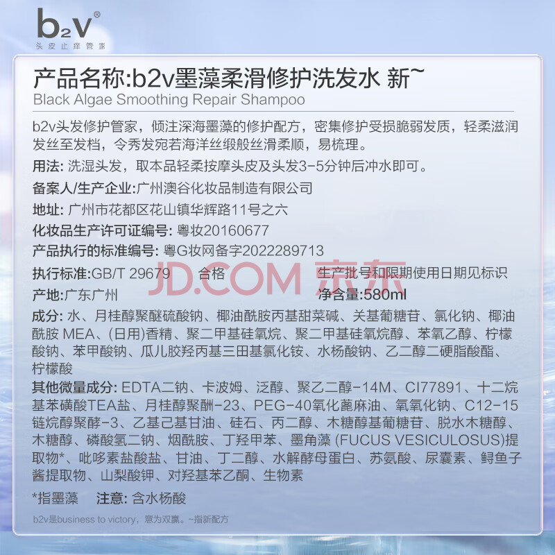 商品相册:b2v墨藻柔顺修护洗发水580ml丝滑保湿滋养干枯毛躁女洗头膏第