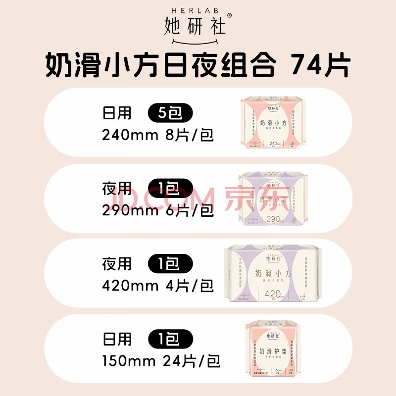 商品相册:她研社奶滑小方绵柔卫生巾套装 超薄日夜组合74片 超薄姨妈巾京东自营第