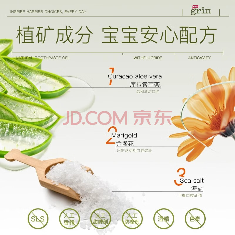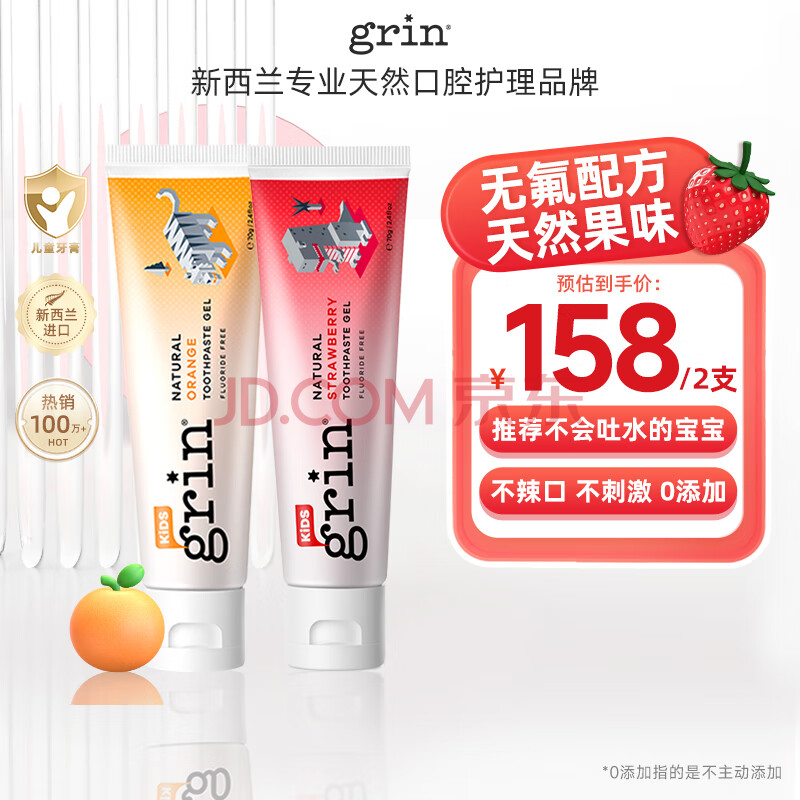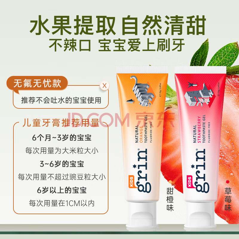 商品相册:grin宝宝儿童牙膏无氟不含氟0-3-6岁婴幼儿牙膏双支装70g草莓+70g甜橙第