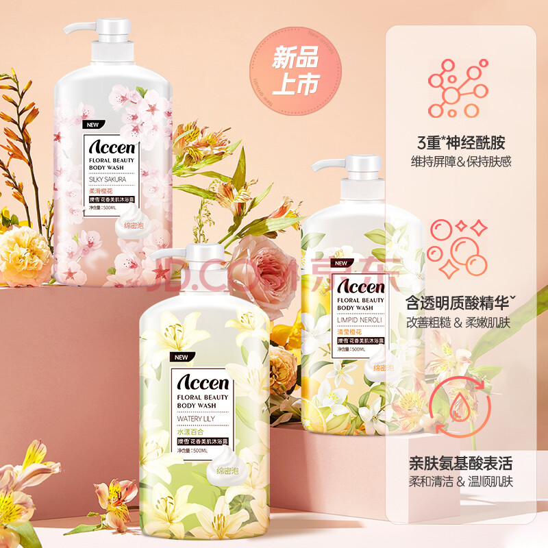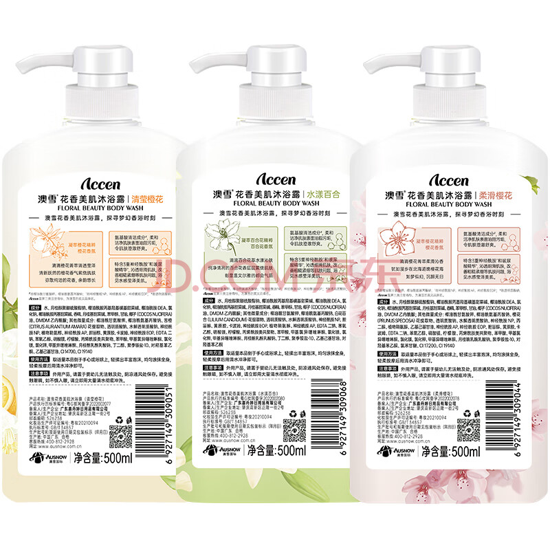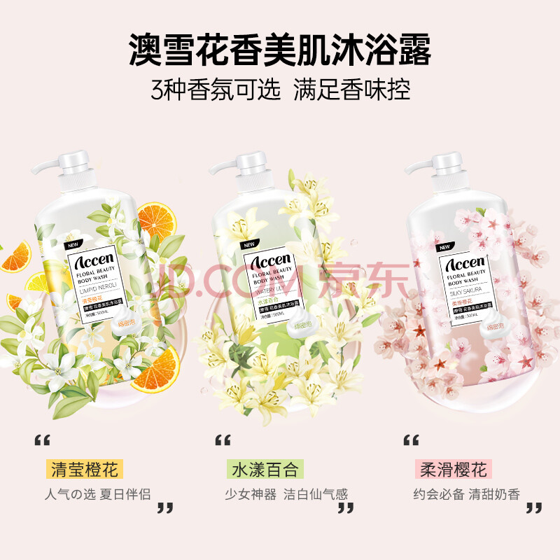 商品相册:澳雪(accen)植萃花香美肌沐浴露套装 500ml百合+500ml橙花+500ml樱花第