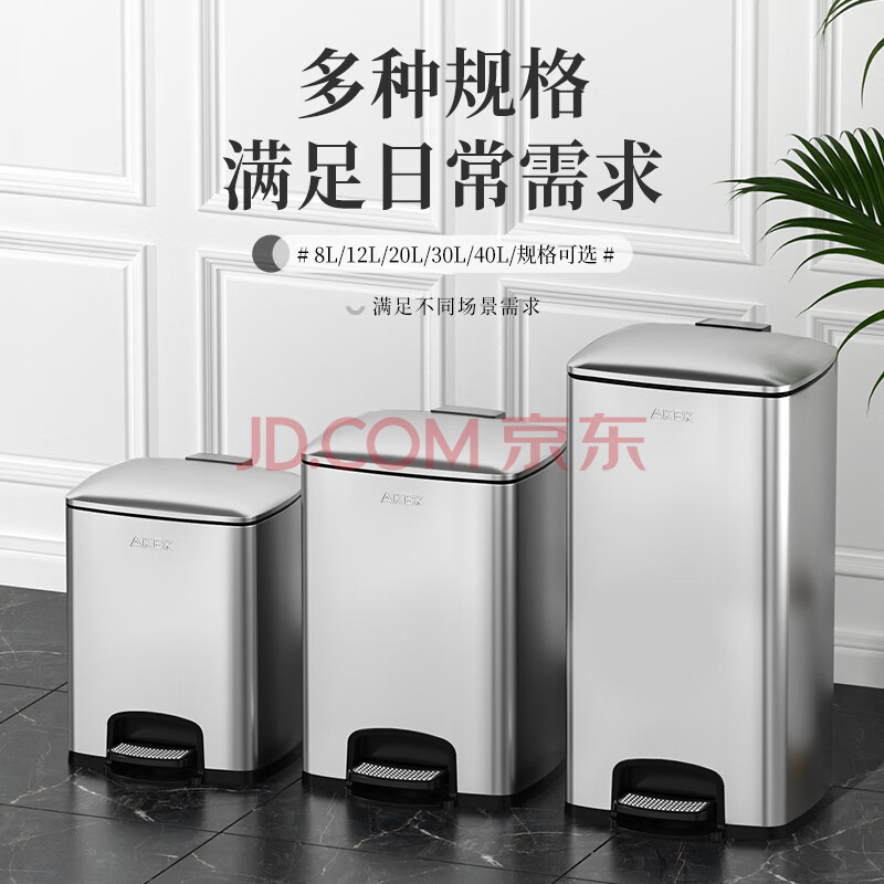 商品相册:AKBK不锈钢垃圾桶20L银色脚踏式厨房客厅办公室高档商用大号翻盖脚踩第