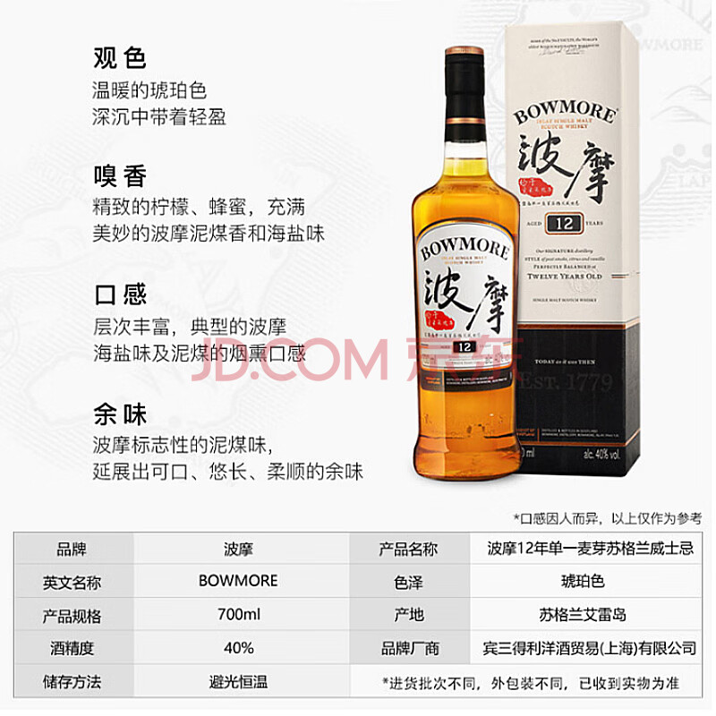 商品相册:波摩(Bowmore)12年单一麦芽700ml 礼盒 苏格兰 艾雷岛 威士忌 洋酒第