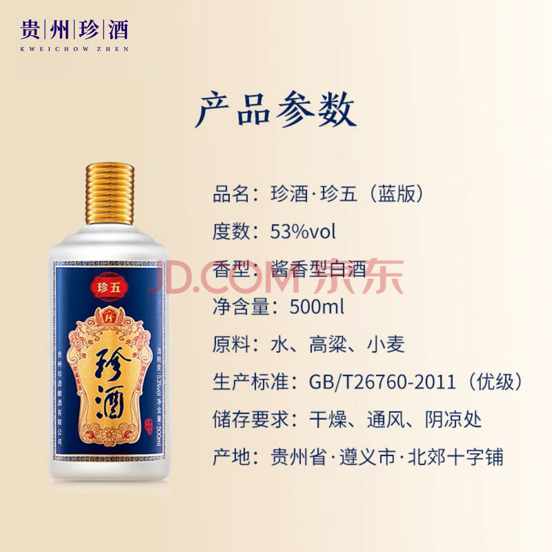 商品相册:珍酒【宴请送礼】珍五蓝 53度酱香型白酒 500ml 单瓶装第