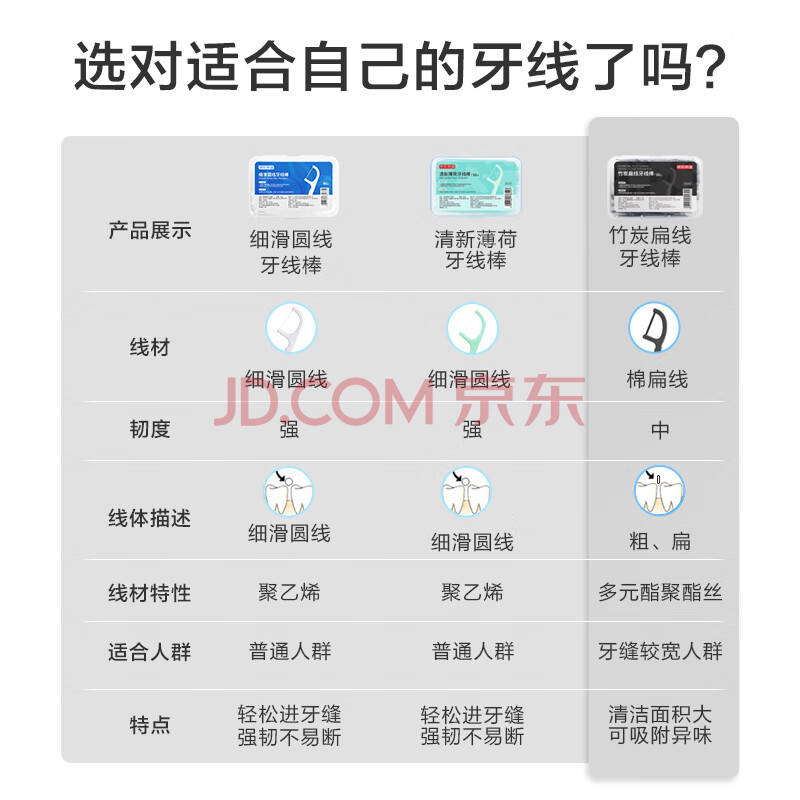 商品相册:京东京造 竹炭扁线牙线棒50支*6盒 宽牙缝适用 清洁齿缝棉线牙签牙线第