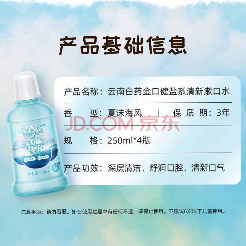 商品相册:云南白药含盐漱口水夏沫海风洁净清新口腔0酒精护龈便携套装250ml*4第