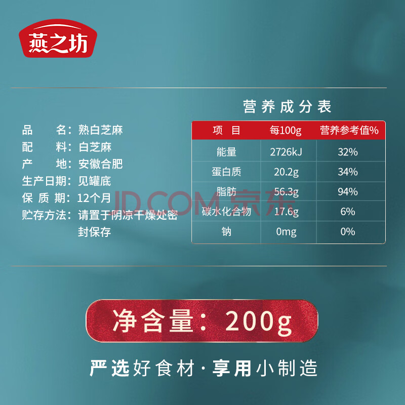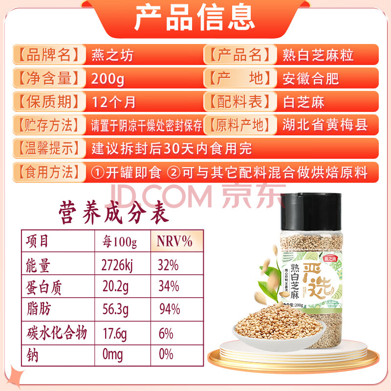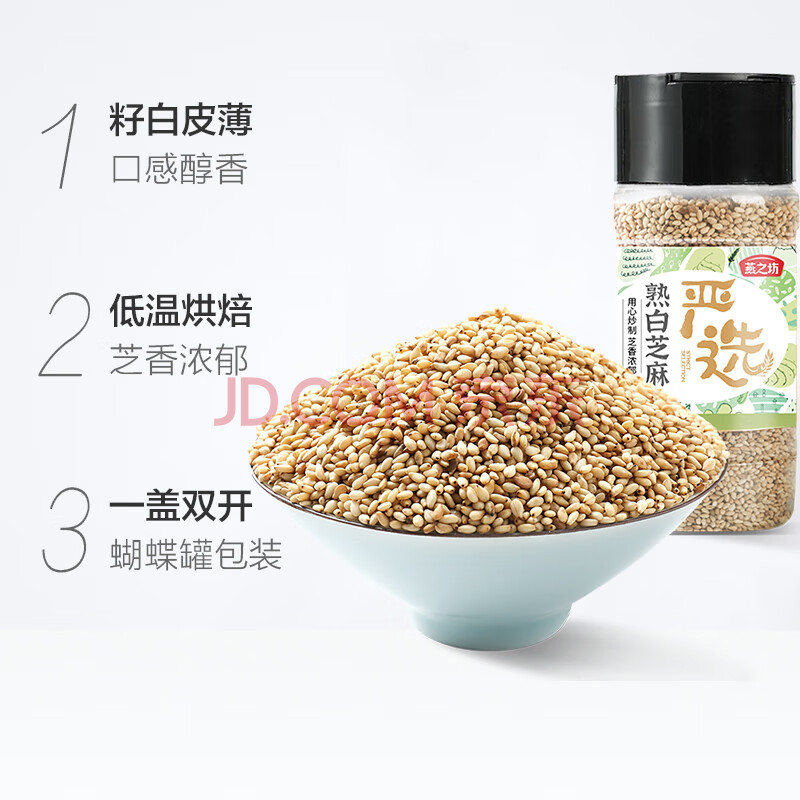 商品相册:燕之坊 熟白芝麻粒 200g(无添加 低温炒制 干吃 五谷杂粮 黑芝麻伴侣)第