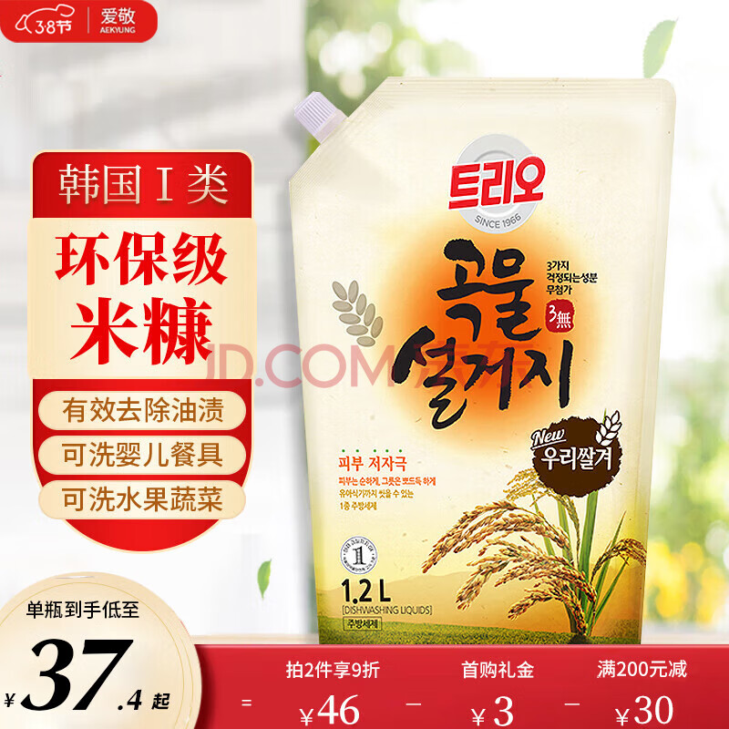 商品相册:爱敬(AEKYUNG)洗洁精谷物米糠洗涤剂1200ml食用级餐具洗碗液餐具去油韩国进口第