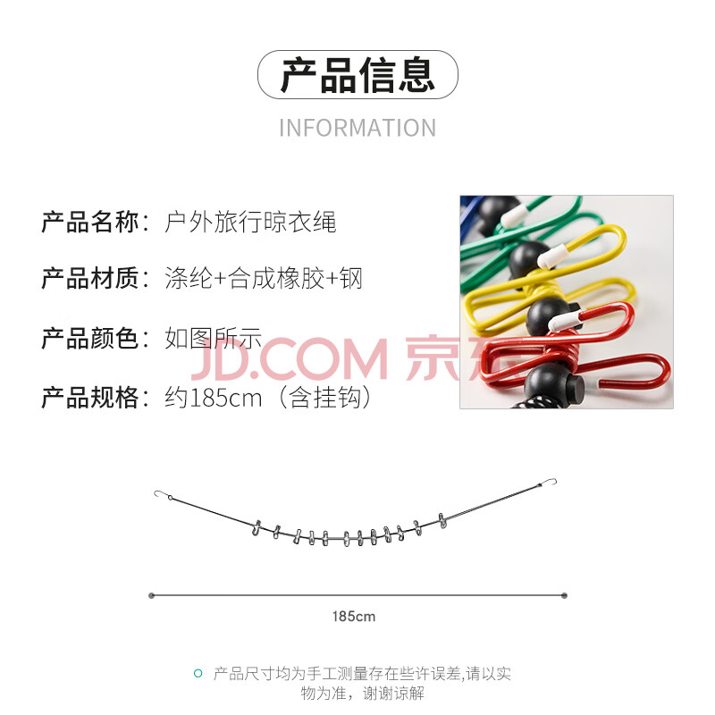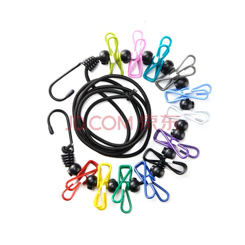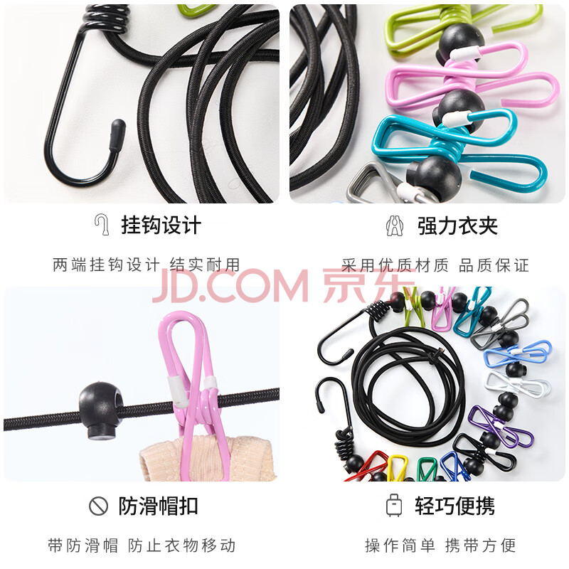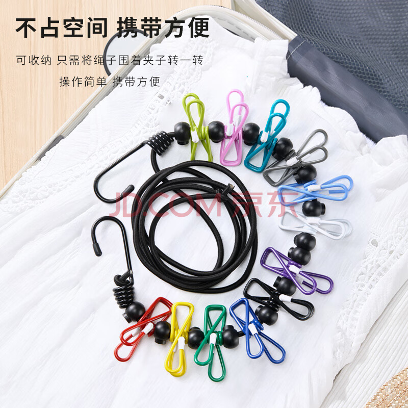 商品相册:易旅旅行晾衣绳带固定夹防滑户外强力晒衣绳免打孔酒店挂晒带12夹彩色第