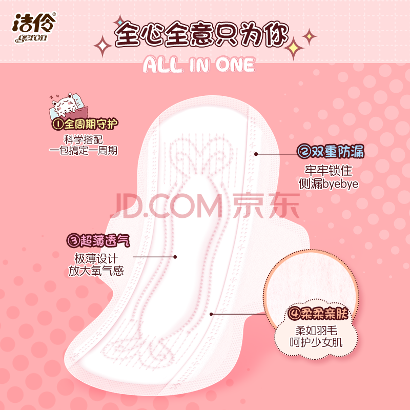 商品相册:洁伶全程护理少女卫生巾日夜组合卫生巾周期护理26片*3包78片京东自营第