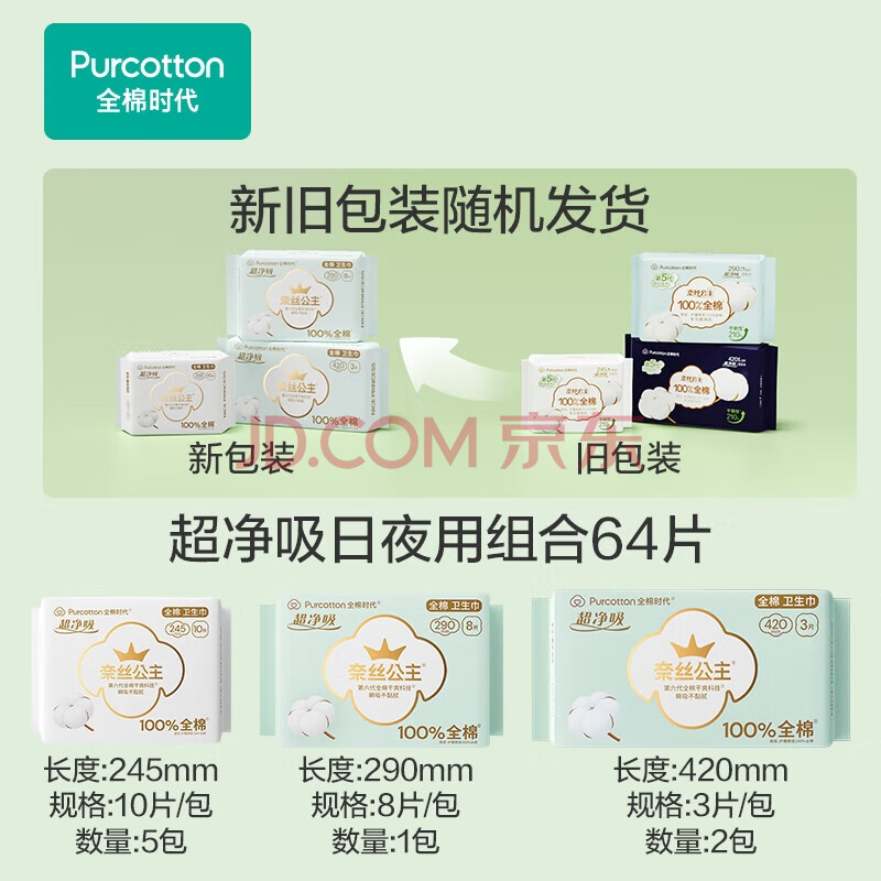 商品相册:全棉时代纯棉姨妈巾日夜组合 日用245mm50片+日夜290mm8片+夜用420mm6片第