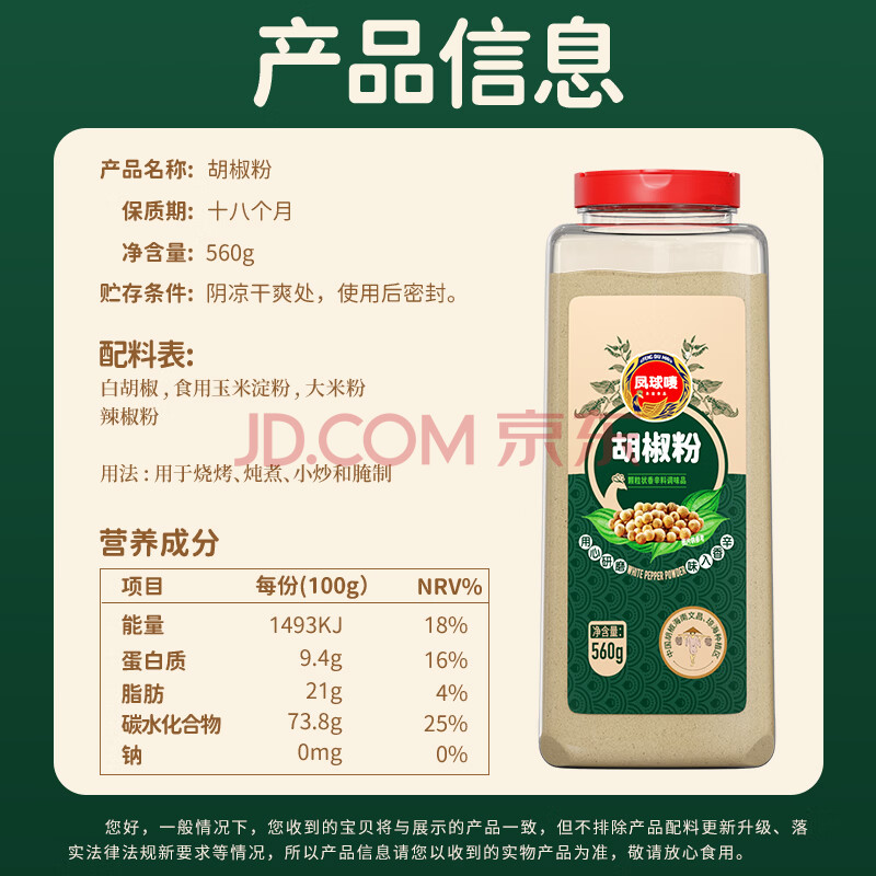 商品相册:凤球唛白胡椒粉560g大瓶装胡辣汤熬汤烧烤煲汤炒菜香辛调味粉料第