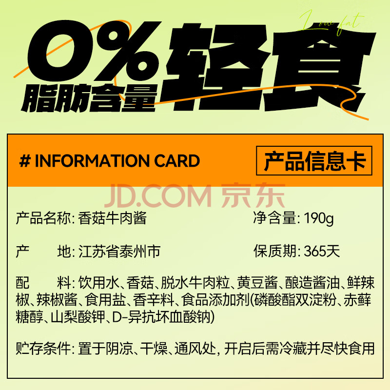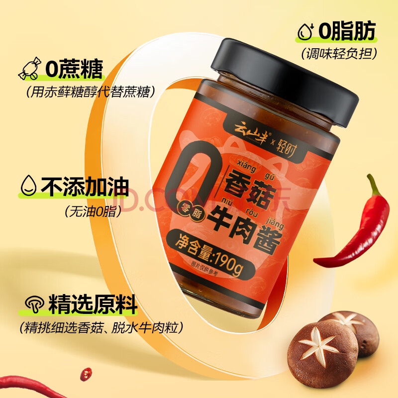 商品相册:云山半0脂肪0蔗糖香菇牛肉酱190g 零添加蔗糖低脂轻食沙拉拌面下饭酱第