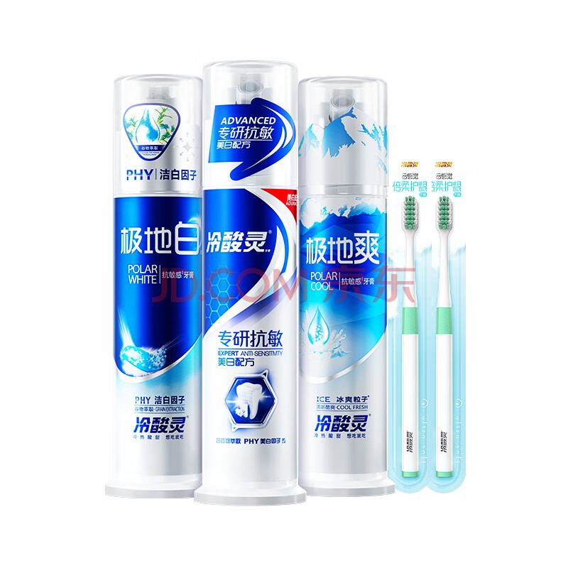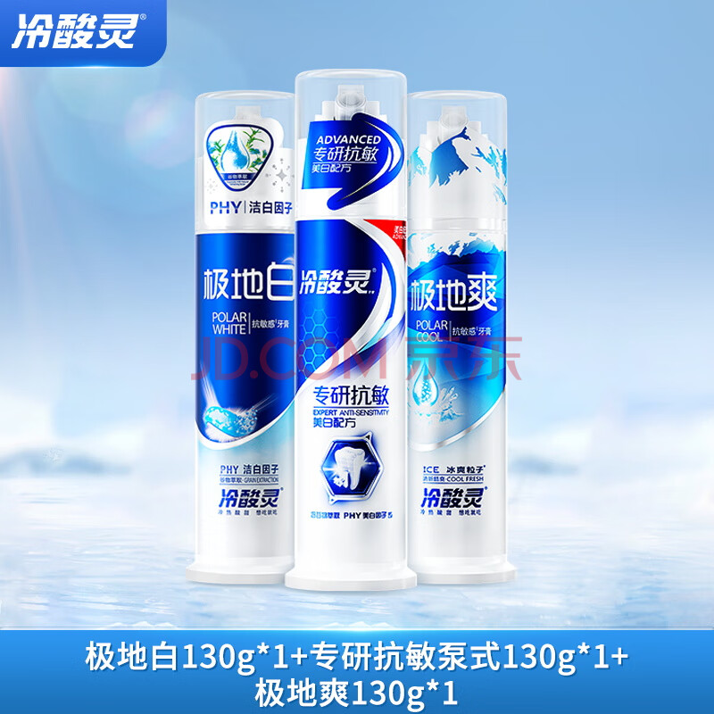 商品相册:冷酸灵极地白抗敏感美白泵式牙膏套装 美白牙齿沁爽清新 130g*3支装第