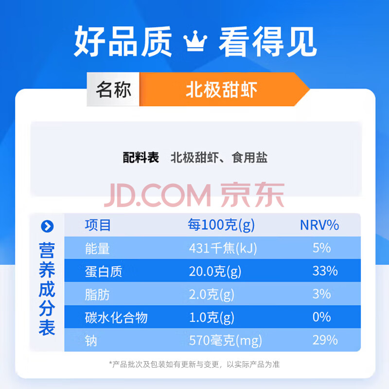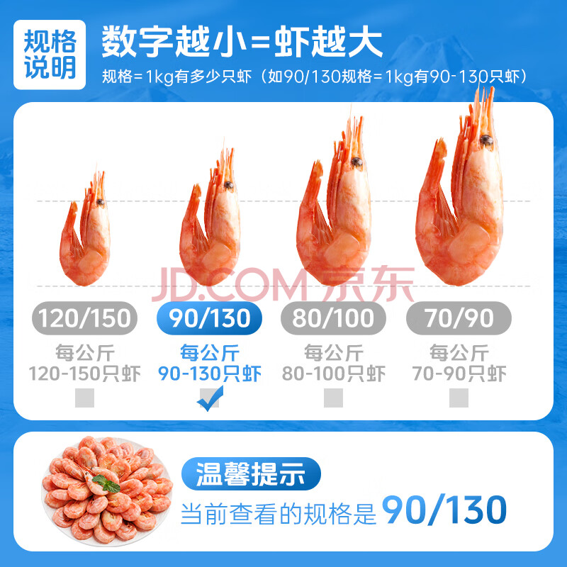 商品相册:美加佳熟冻北极甜虾腹籽净重3斤 90/130规格 熟冻甜虾 海鲜水产第