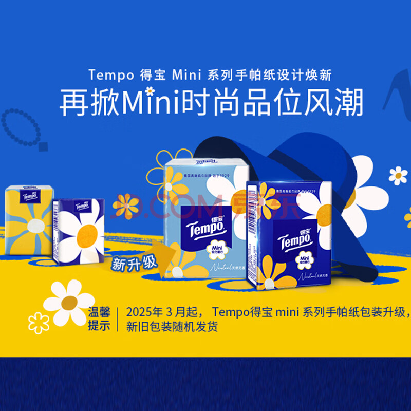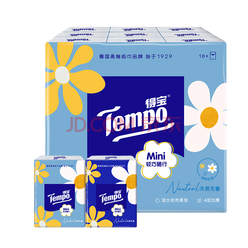 商品相册:得宝(TEMPO)一博同款 手帕纸 Mini系列4层5张*18包 湿水不破 纸巾小包 面巾纸第