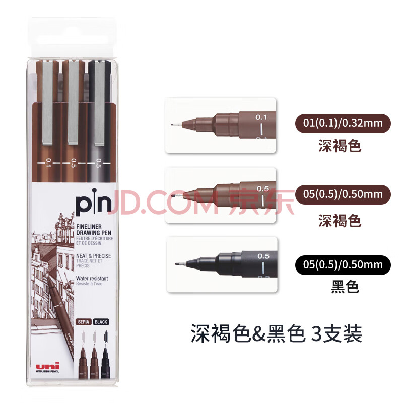 商品相册:uni三菱 水性绘图针管笔 PIN-200美术漫画设计描边描线笔勾线笔 黑色/深褐色 3支套装第