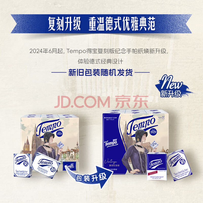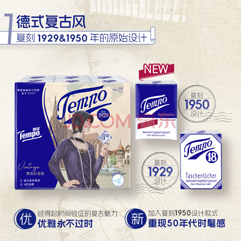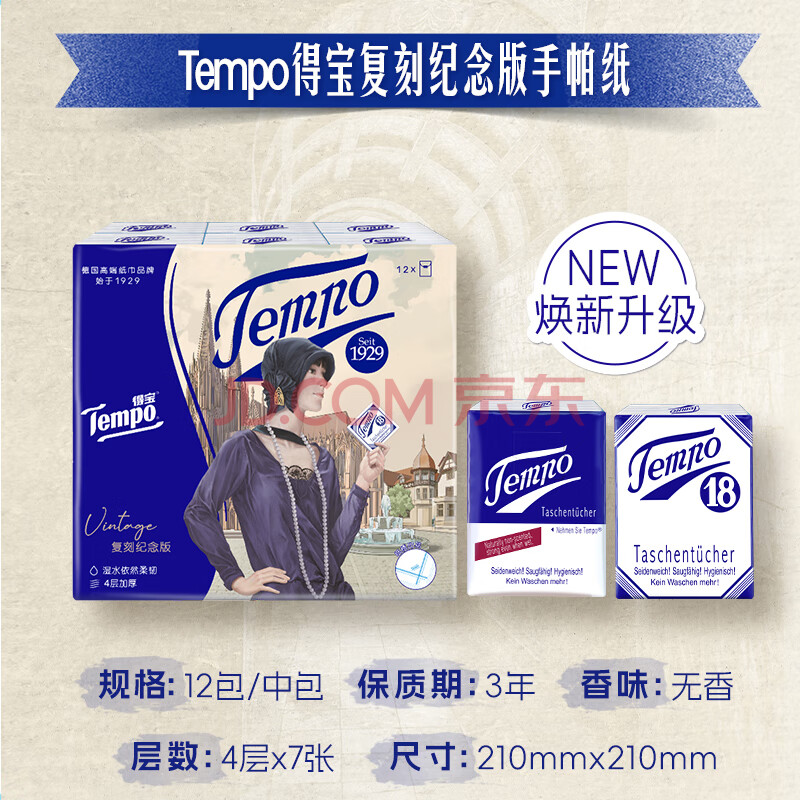 商品相册:得宝(TEMPO)一博同款 手帕纸 复刻版经典款4层7张*12包 湿水不破 纸巾小包第