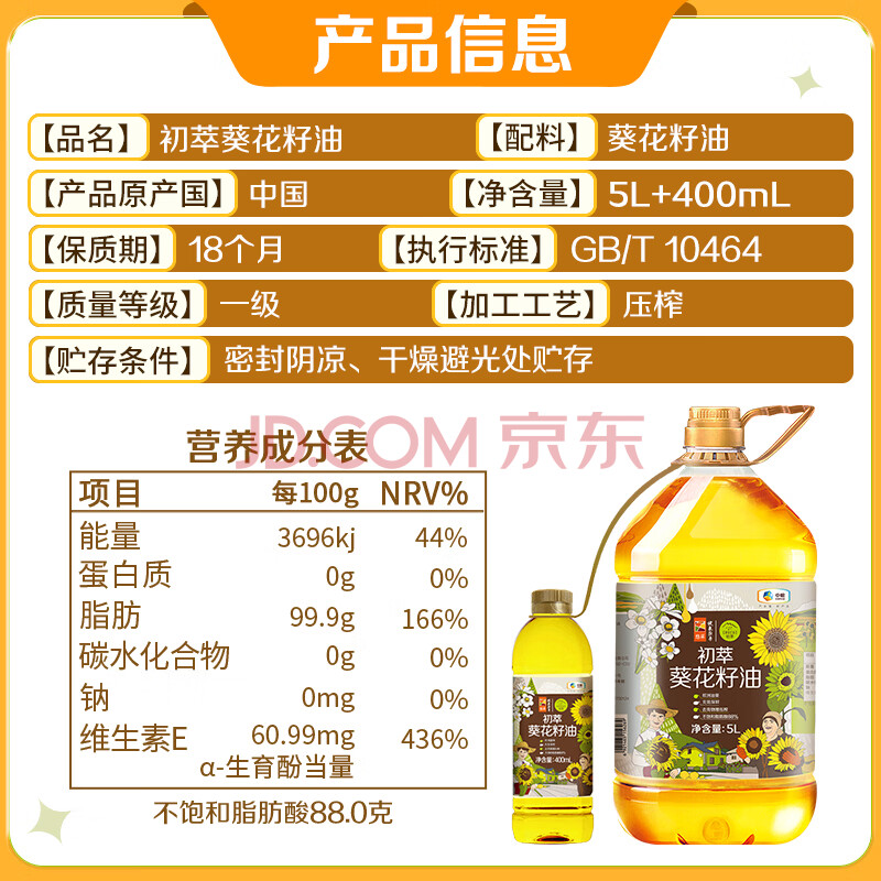 商品相册:初萃 中粮葵花籽油5L+400mL 一级 物理压榨 充氮保鲜 食用油第