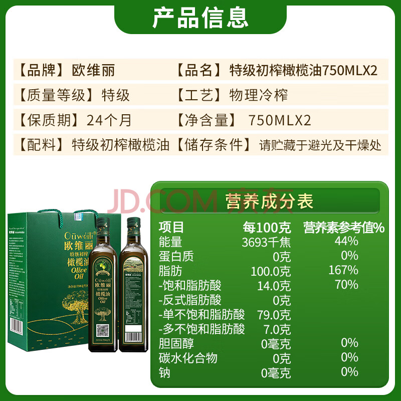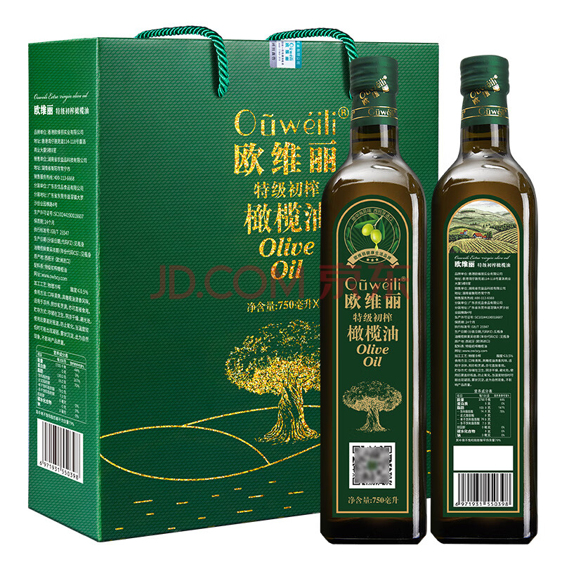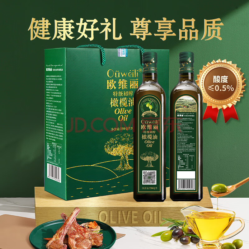 商品相册:欧维丽(Ouweili)保真橄榄油 西班牙进口原油特级初榨750ml*2瓶橄榄油礼盒第