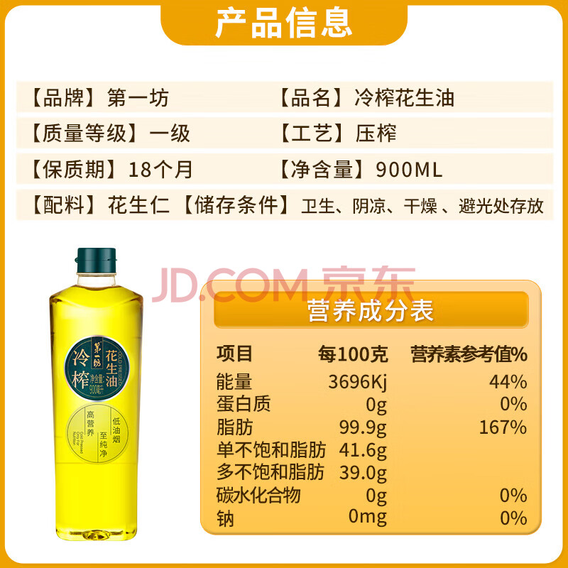 商品相册:第一坊 【保真花生油】冷榨花生油900mL 食用油 压榨一级 冷榨工艺第