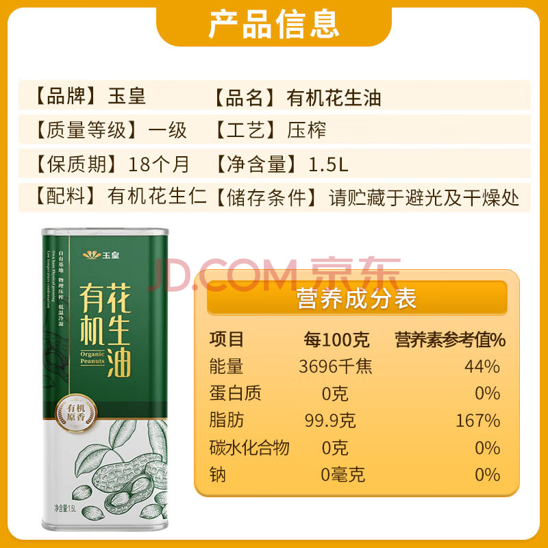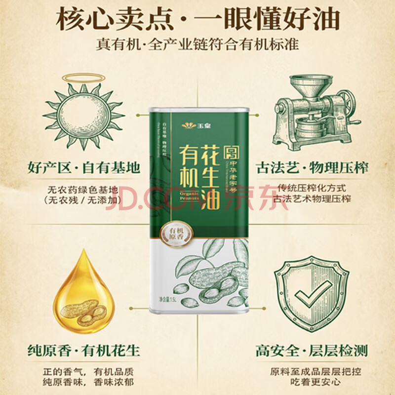 商品相册:玉皇【中华老字号】有机原香花生油 1.5L 当季山东新花生第