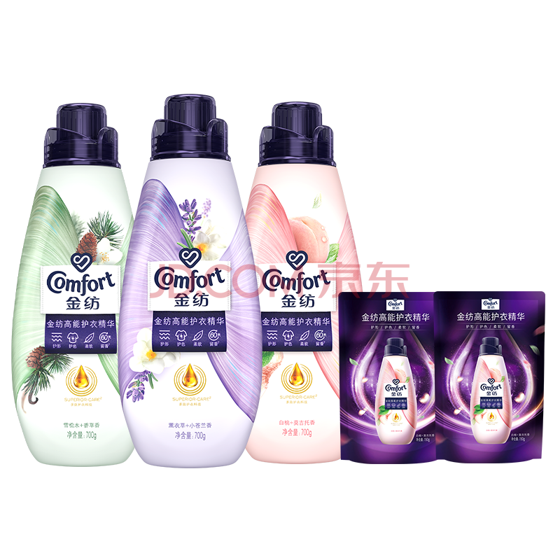 商品相册:金纺高能护衣精华柔顺剂雪松白桃苍兰玫瑰700g*3+300g款式香型随机发第