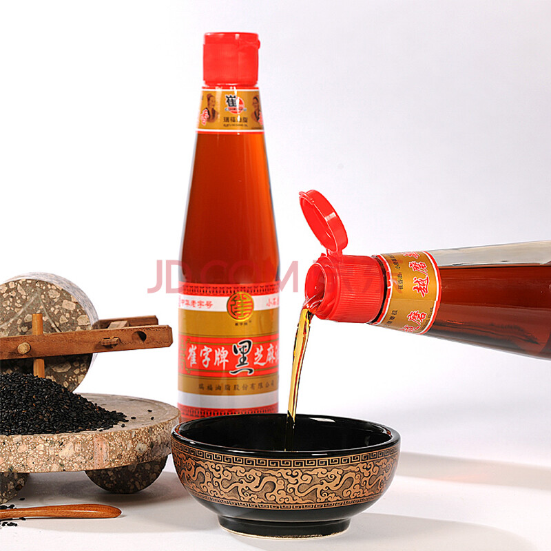 商品相册:崔字牌小磨黑芝麻香油448mL水代法香油 火锅油碟 蘸料 中华老字号第