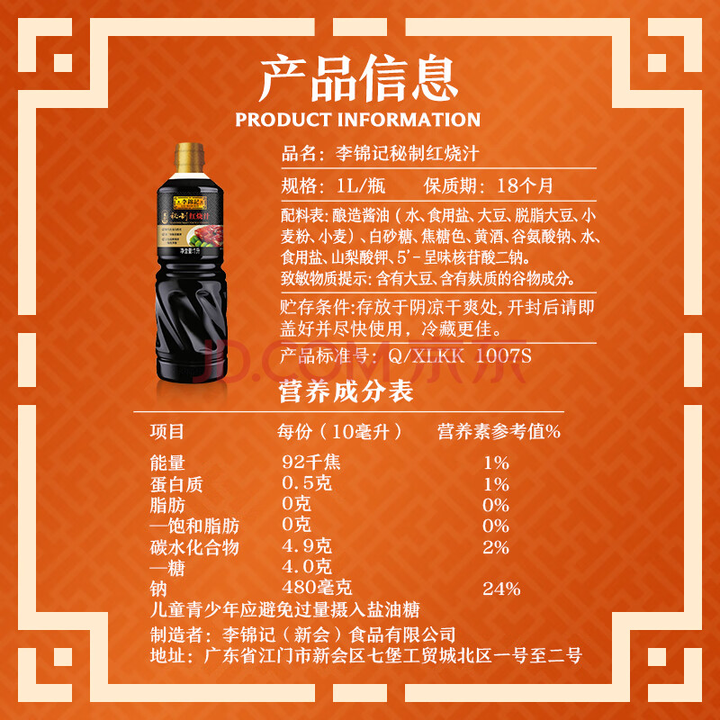 商品相册:李锦记 秘制红烧汁1L 酱香醇厚 香浓红烧 上色卤味生抽老抽酱油第