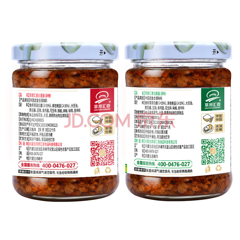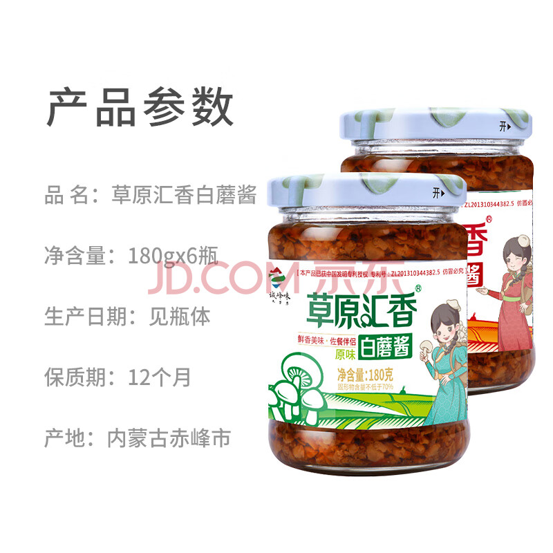 商品相册:草原汇香 蘑菇酱 180克*6瓶草原白蘑酱 原味+辣味拌饭蘑菇酱香菇酱第