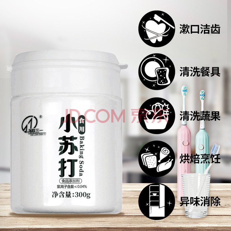 商品相册:海联三一小苏打粉食用烘焙清洗果蔬去异味清洁污除垢刷牙洁齿广口瓶300gx3第
