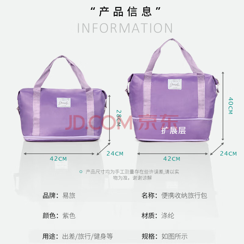 商品相册:易旅旅行包 行李包多功能大容量手提包旅游出差 可扩展款 紫色第