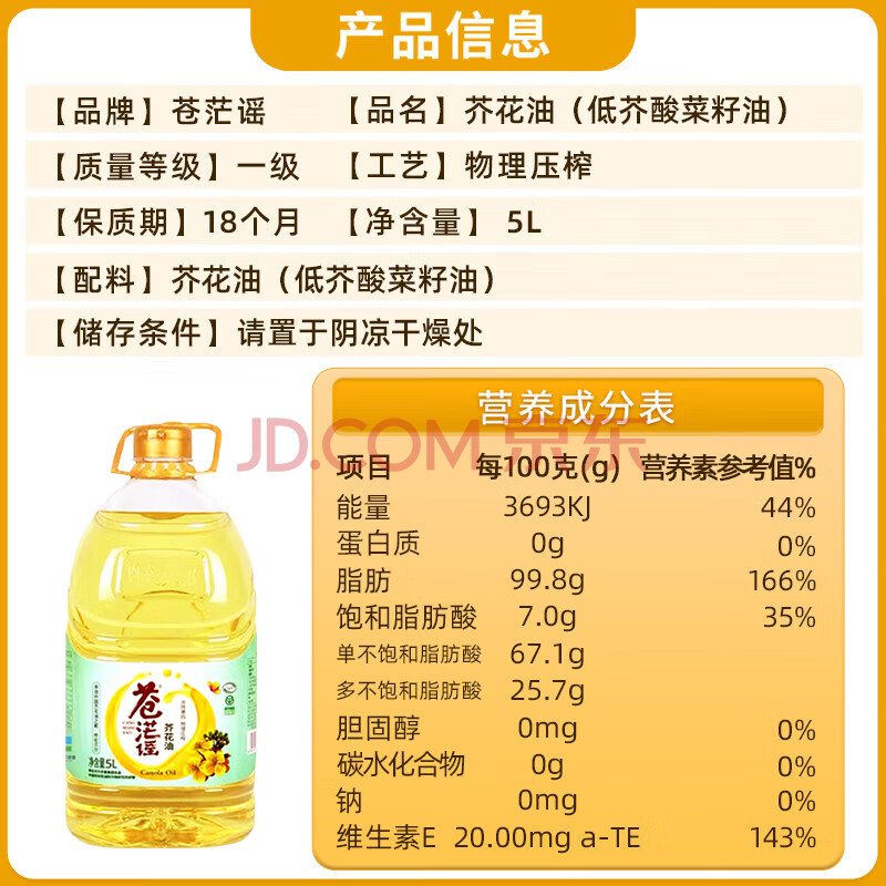 商品相册:苍茫谣(CangmangYao)【保真菜籽油】芥花油非转基因压榨一级低芥酸5L食用油国企出品第