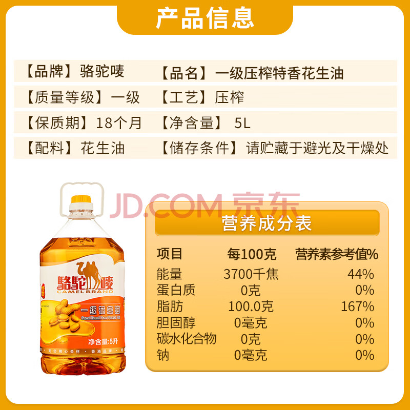 商品相册:骆驼唛【保真花生油】一级物理压榨特香花生油5L 中国香港品牌 Q唛认证第