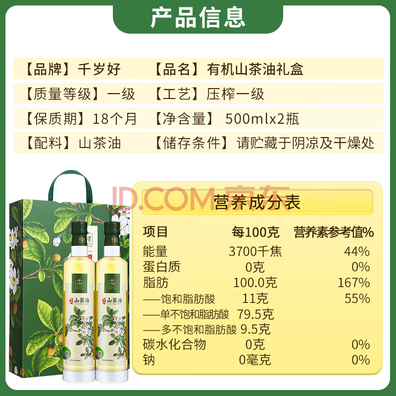商品相册:千岁好【保真山茶油】有机山茶油礼盒500ml*2瓶 压榨一级 送礼礼盒第1张/共9