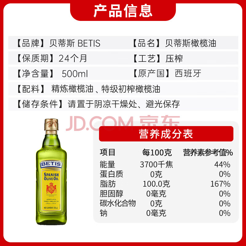 商品相册:贝蒂斯(BETIS)【保真橄榄油】纯正橄榄油500ML 食用油 西班牙原装进口第