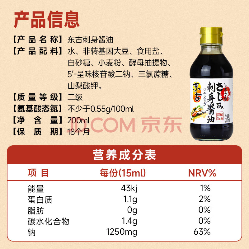 商品相册:东古 刺身酱油【日式酱油】200ml 寿司海鲜刺身鱼片生抽 0脂凉拌第