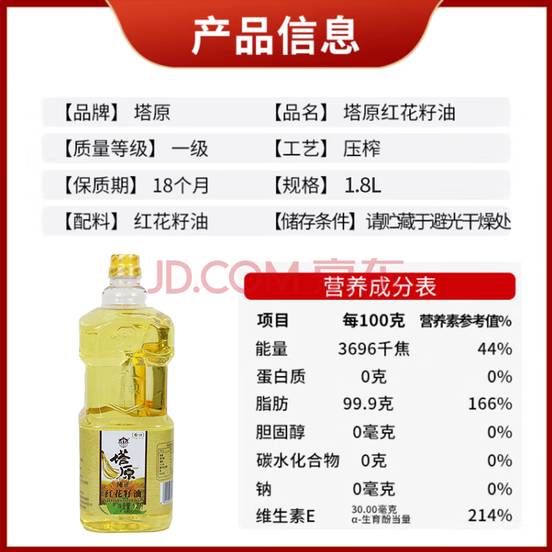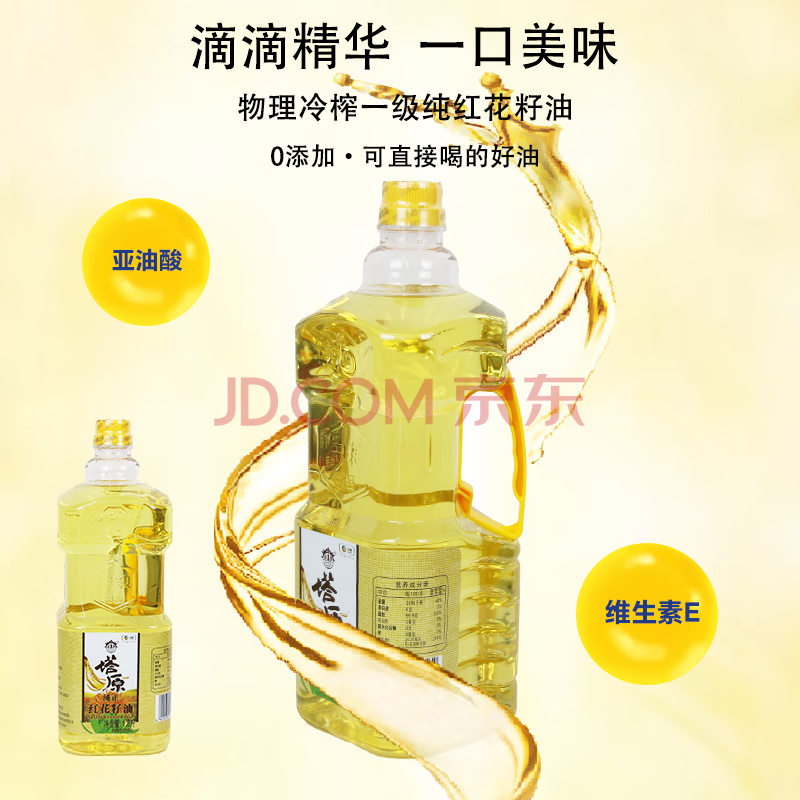 商品相册:塔原新疆红花籽油1.8L 物理压榨 一级 植物油 纯正红花籽油中粮出品第