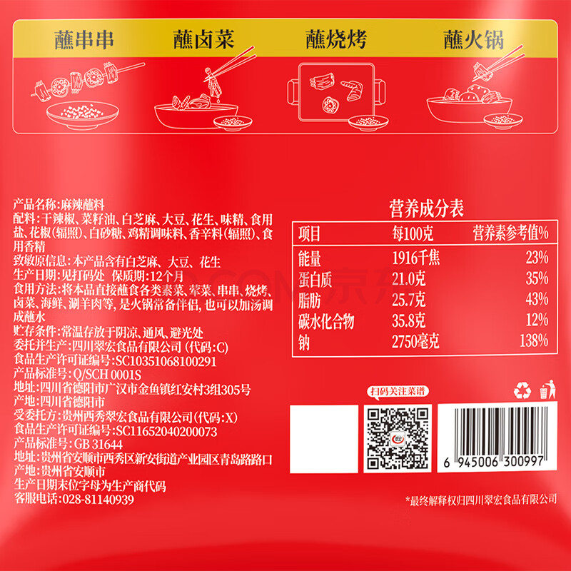 商品相册:翠宏 火锅蘸料 麻辣蘸料 火锅烧烤调料辣椒面 麻辣蘸碟 10g*10袋第