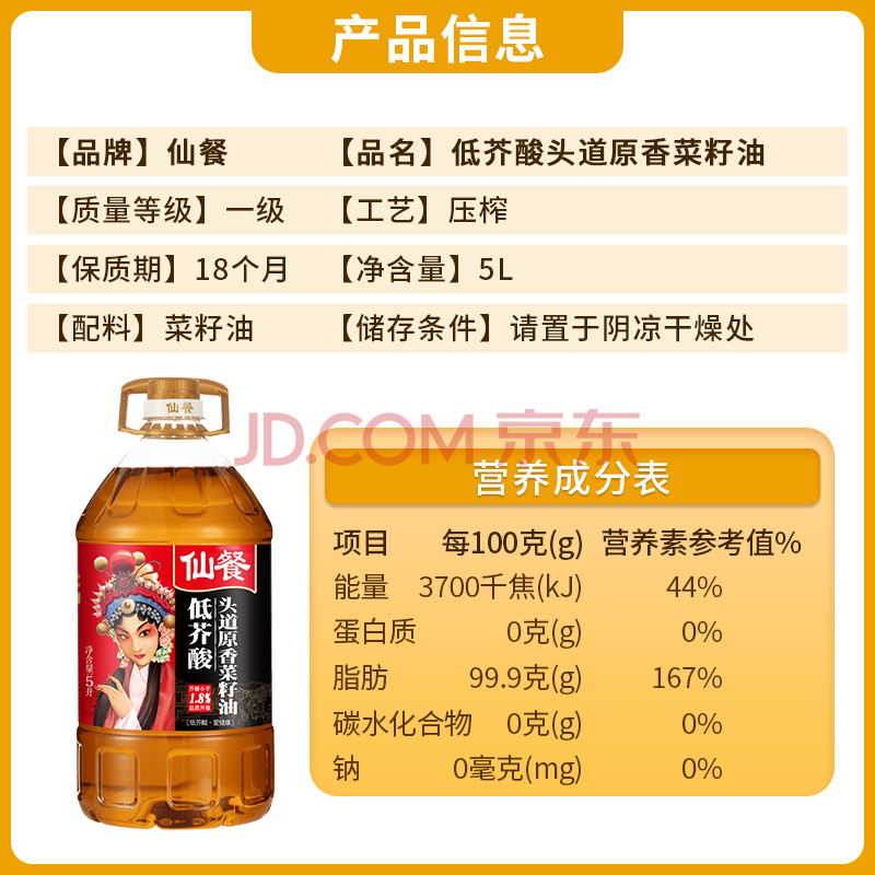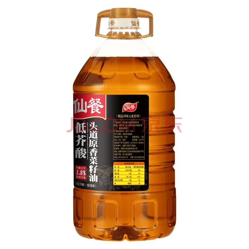 商品相册:仙餐牌【国企出品】低芥酸头道压榨非转基因原香菜籽油 5L 第