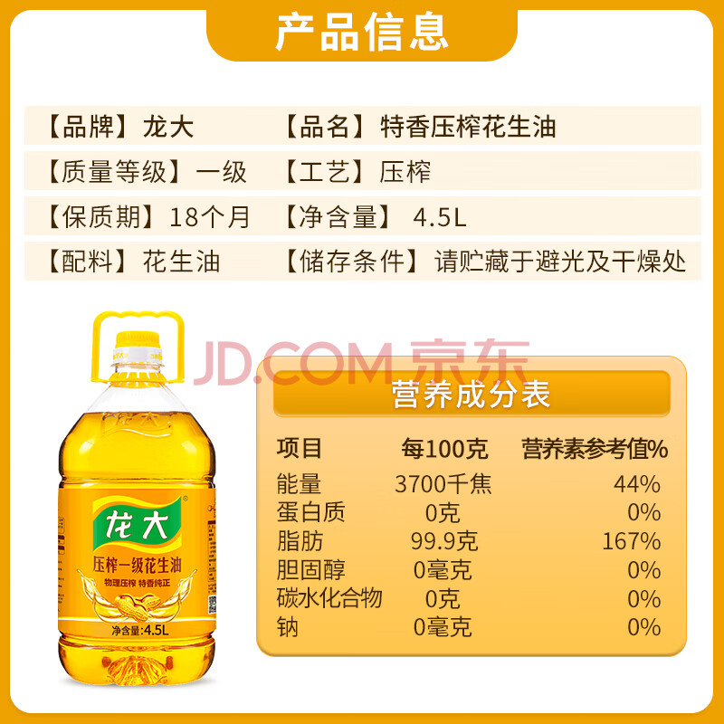 商品相册:龙大【保真花生油】 食用油 压榨一级 特香花生油 4.5L 新花生新鲜油第