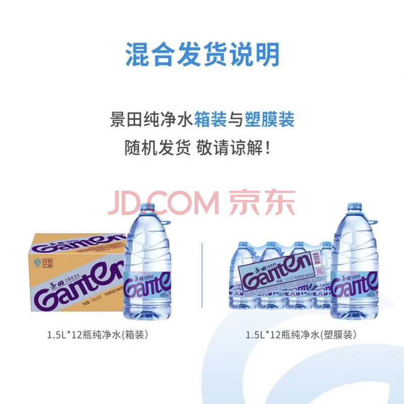 商品相册:景田 饮用纯净水 1.5L*12瓶 箱装塑膜装混发 会议办公用水 家庭饮用水第