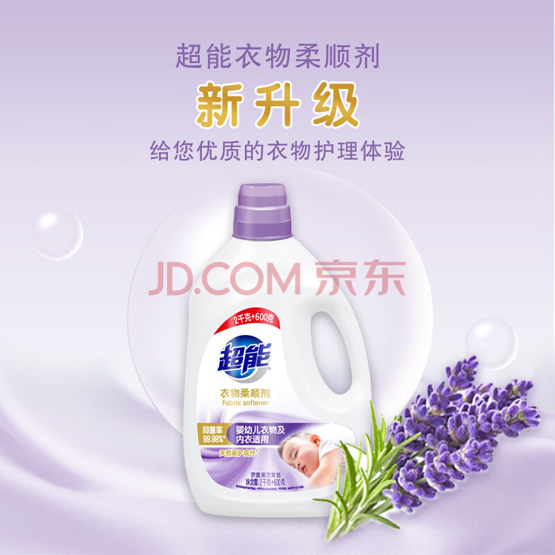 商品相册:超能衣物柔顺剂 5.2斤 薰衣草香 婴幼儿衣物适用 抑菌99.99%第