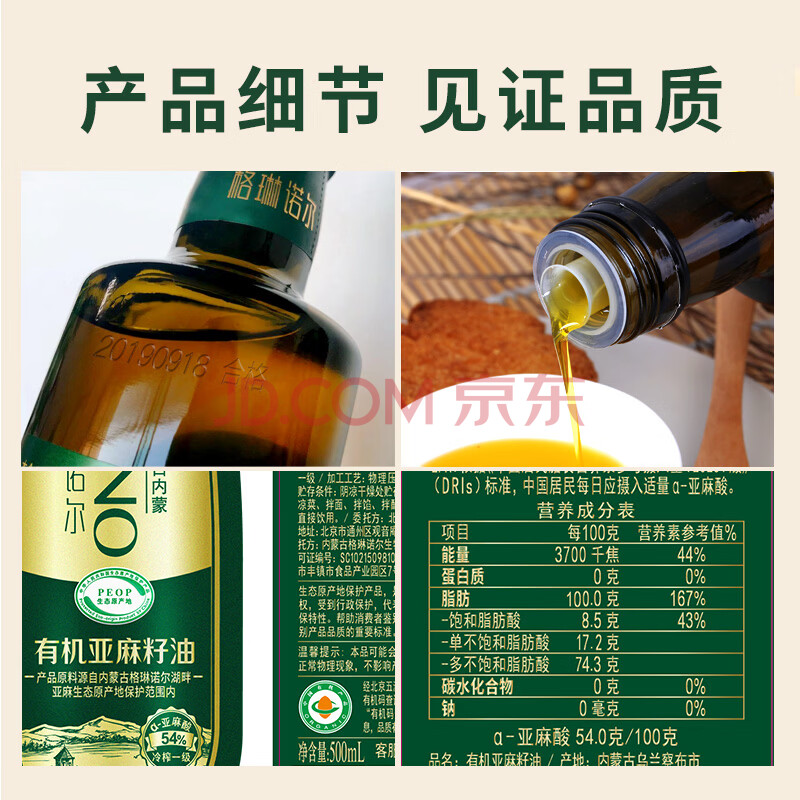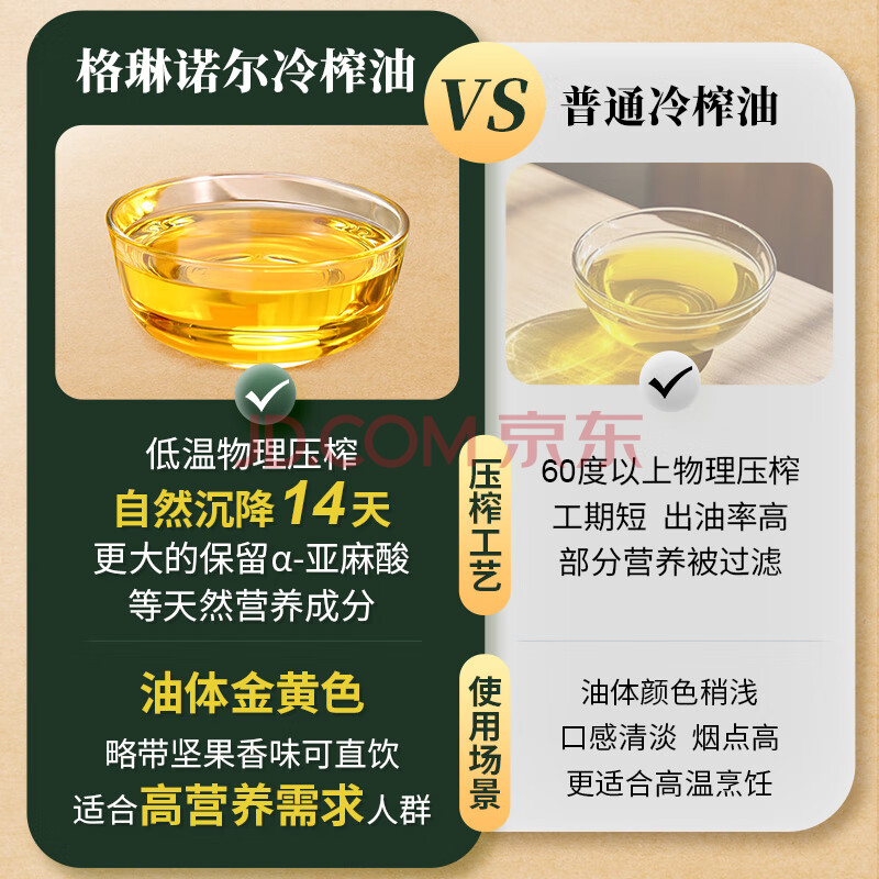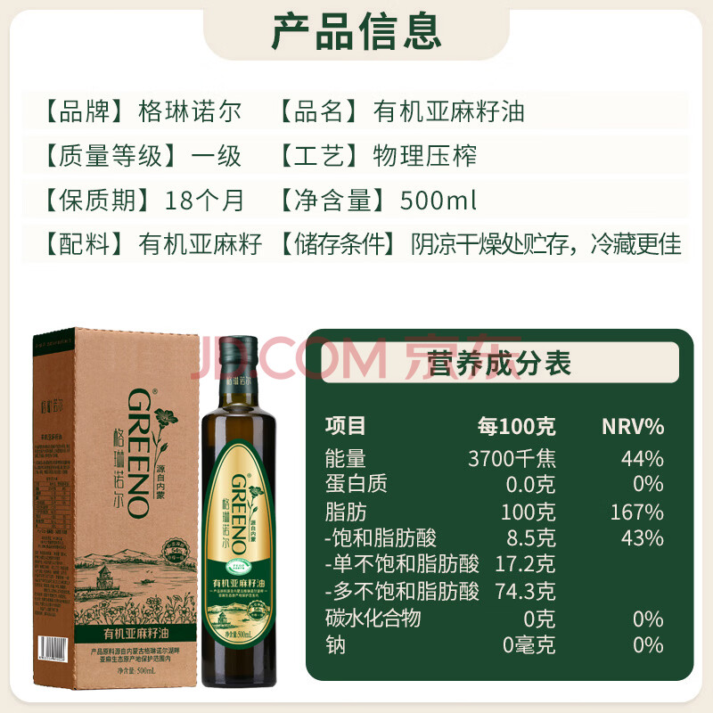 商品相册:格琳诺尔一级冷榨直接喝有机亚麻籽油500ml 可搭紫苏籽油含Omega3植物油第