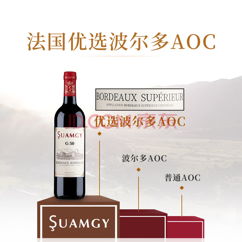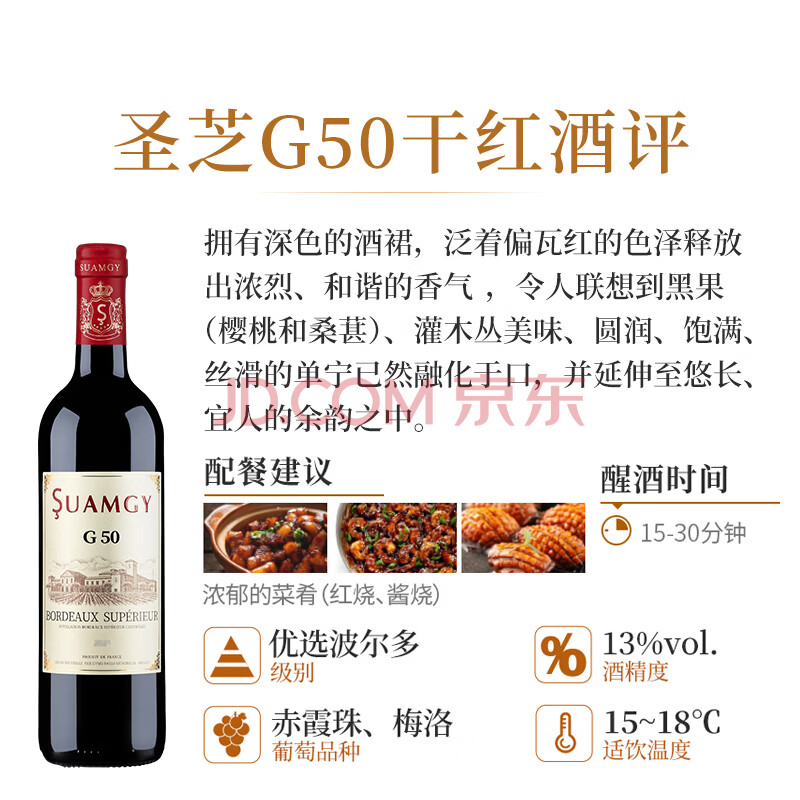 商品相册:圣芝(suamgy)G50优选波尔多AOC赤霞珠干红葡萄酒750ml*6支整箱礼盒装 法国红酒第