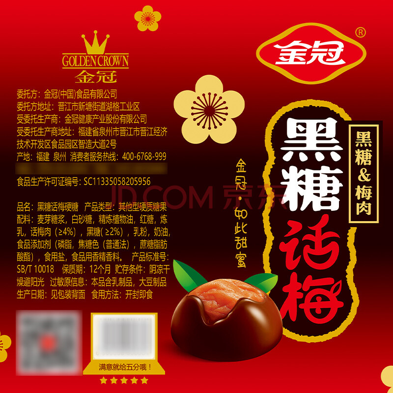 商品相册:金冠 黑糖话梅糖 160g 约23颗 夹心硬糖 结婚喜糖 儿童休闲零食糖果第