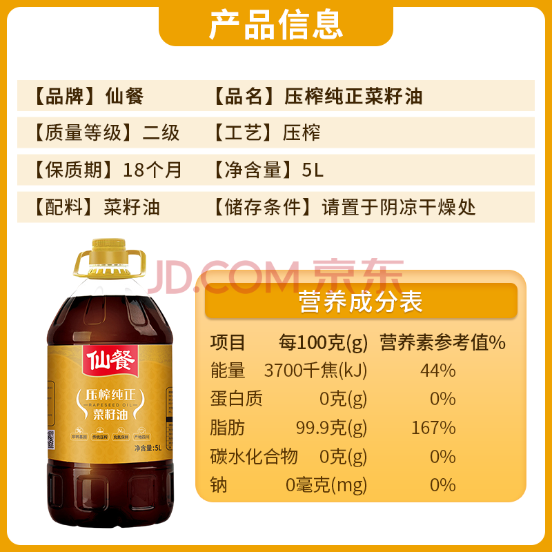 商品相册:仙餐牌食用油 四川风味压榨菜籽油 5L第