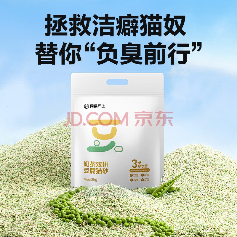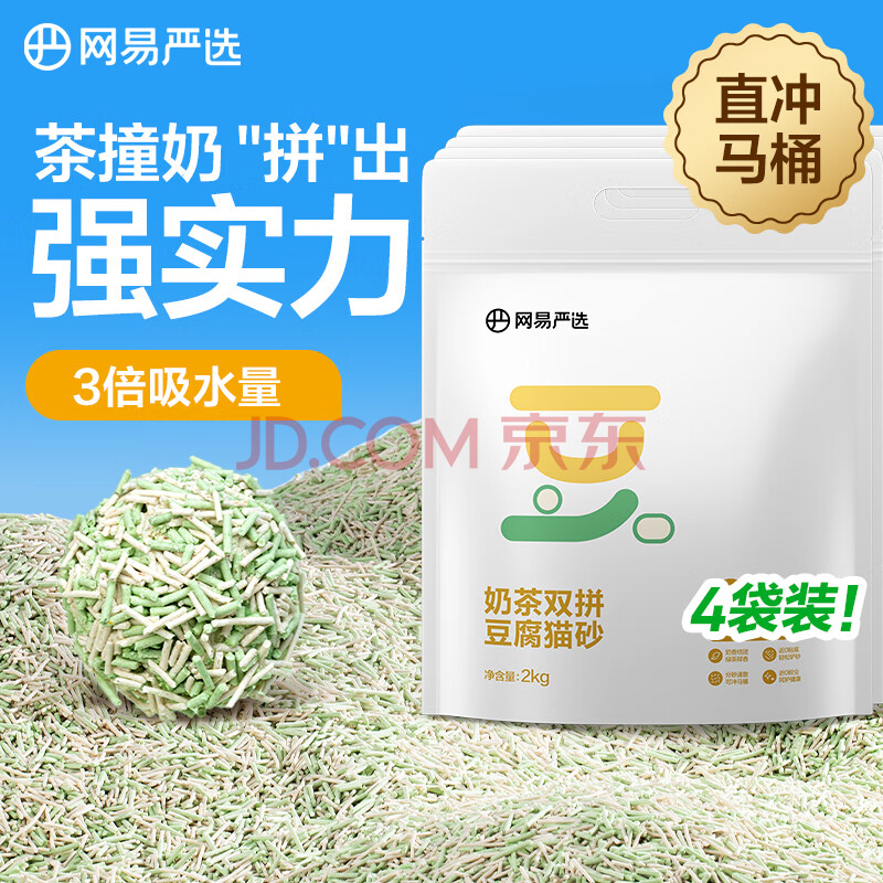 商品相册:网易严选 奶茶双拼豆腐猫砂快速吸水无尘猫砂除臭豆腐砂 2kg*4包整箱装第